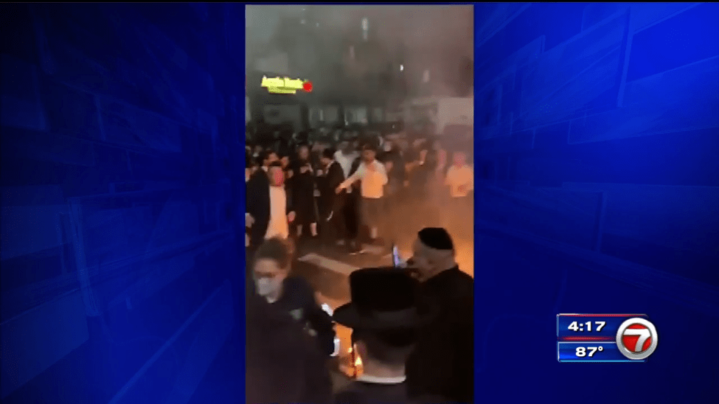 Video of the protests shows a large group of people wearing traditional black hats and long suits — few of whom are wearing masks — surrounding what appears to be a rubbish fire in the street. It is not clear how the fire began.