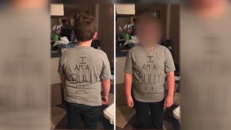 The self-described “old school parent” says she doesn’t coddle her children, and wanted to show him his actions have consequences. So she sent him to school in a gray shirt that read “I am a bully” with a frowning face on the front and back.