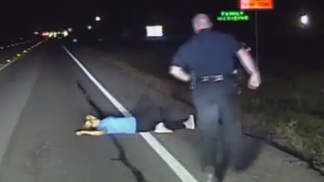 The officer got out of his car and ran toward the woman to wake her up. She managed to stand up on her own, but appeared to stumble backward.