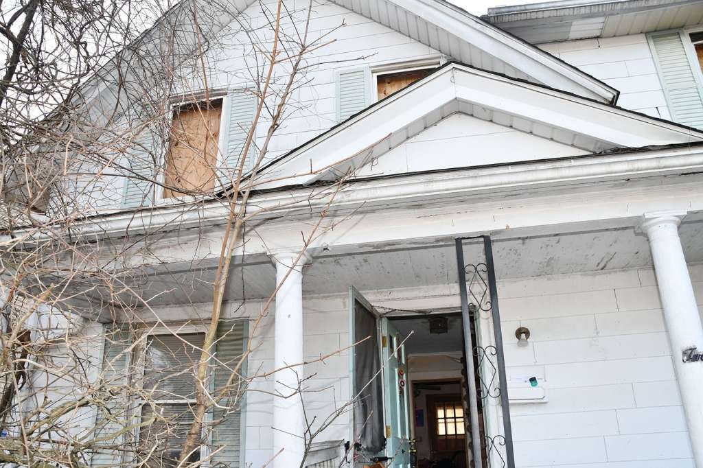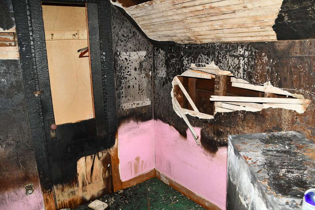 Some rooms are visibly charred from the fire, while others appear cluttered and decrepit due to a lack of maintenance over the years.