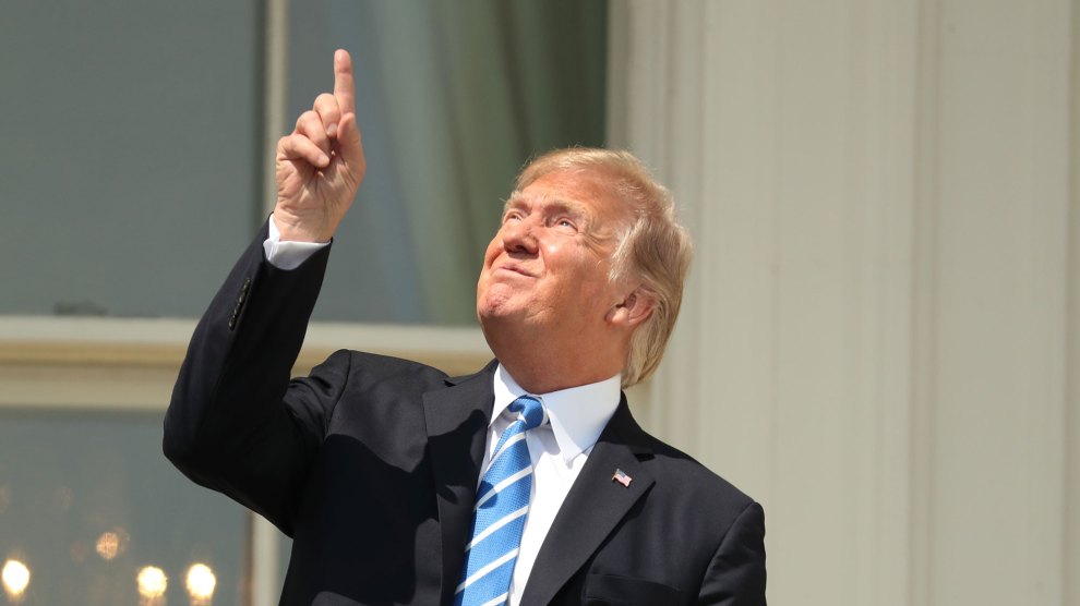 Trump then donned the protective eyewear. Asked about the view, Trump gave a thumbs up.