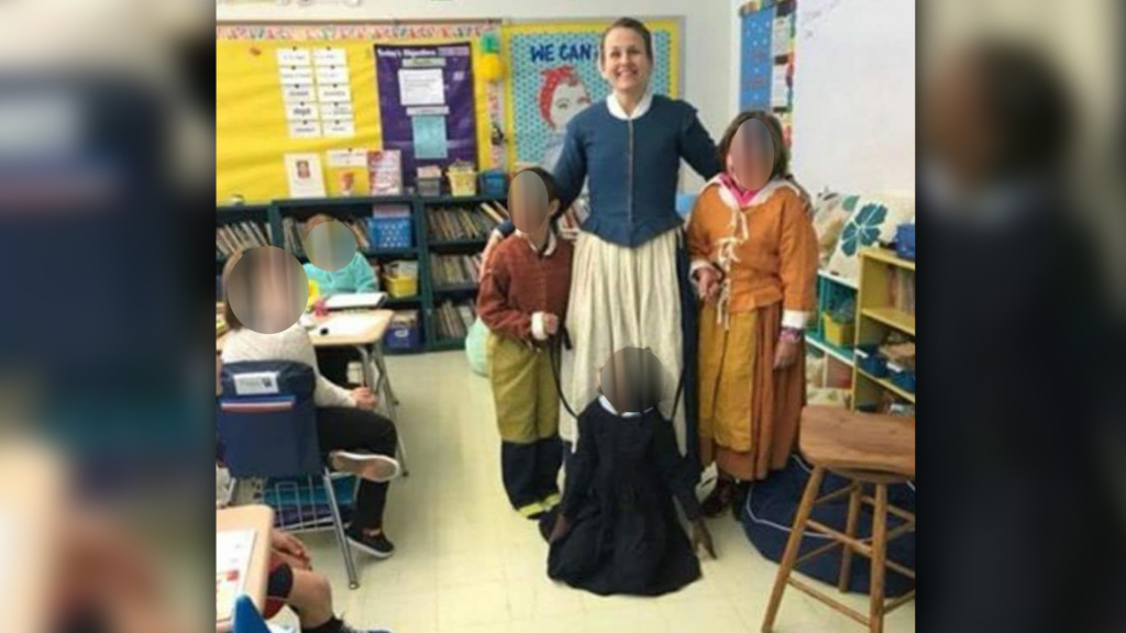 “The photo in question can clearly be explained. It captures a moment in a classroom visit where one of Plimoth Plantation’s Living History Educators who visited a third grade class is sharing highlights of life in the 17th century.