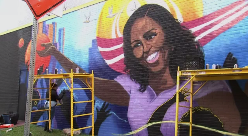 The mural shows a smiling Obama as she raises her hand toward the sky.