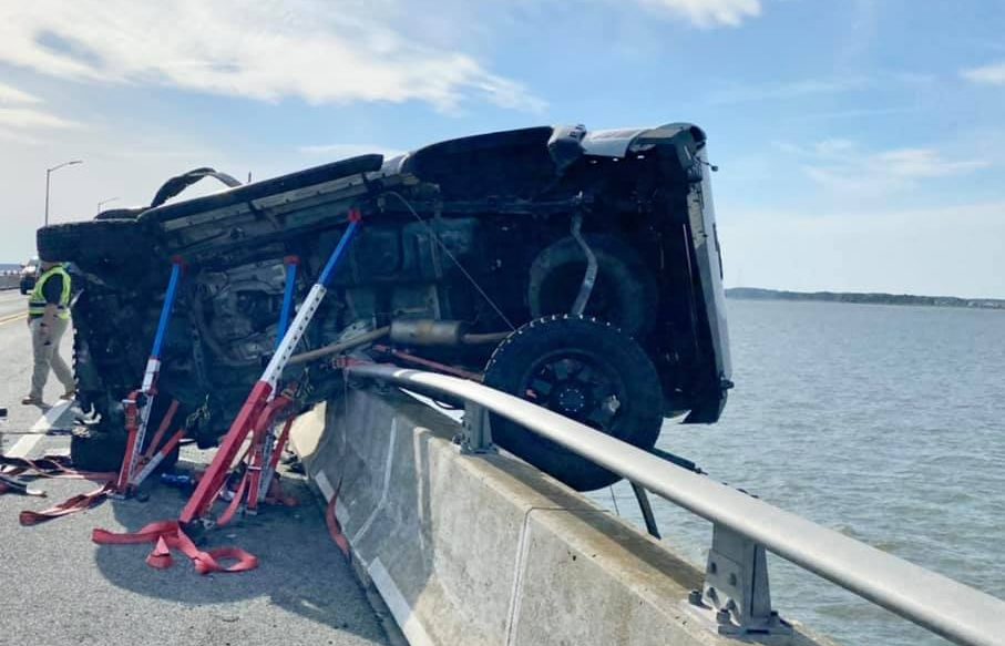 Authorities called to the scene discovered the truck hanging off the side of the bridge.