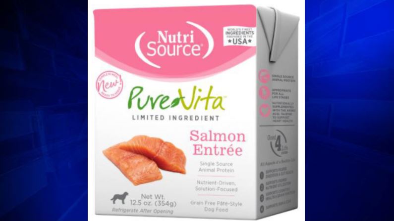 The recall is for approximately 1,600 cases of Pure Vita Salmon Entree Dog Food in a Tetrapak carton, the pet food manufacturer said.
