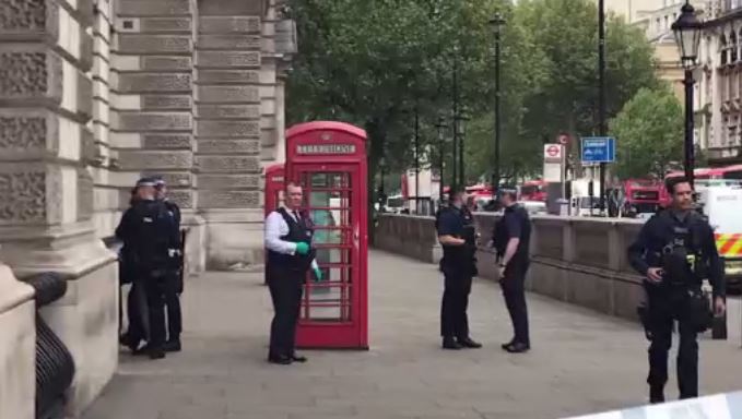 As armed police blocked off Whitehall, a street lined with government buildings that is the main artery of London’s government district, witnesses reported seeing and a man on the ground surrounded by police.