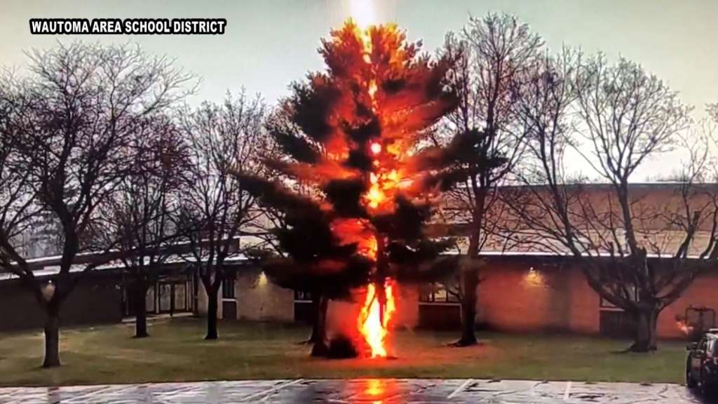Video posted on the US National Weather Service Green Bay Wisconsin Facebook page shows lightning strike a pine tree Thursday. You can see the tree light up down the middle, shatter, and plummet to the ground in pieces.