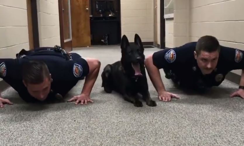 The video, posted to Facebook by the Gulf Shores Police Department, shows Officers Cowan and Hancock doing push ups along with K-9 officer Nitro, as they get “warmed up and ready to apprehend any bad guys that break the law.”