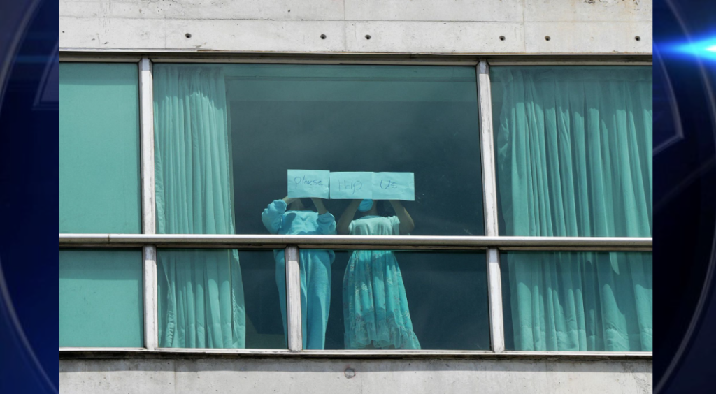 At the hotel, some migrants tried to voice their concerns by sending distress signals to journalists gathered outside. Standing in front of their windows, they held up pieces of paper with handwritten notes begging for support.