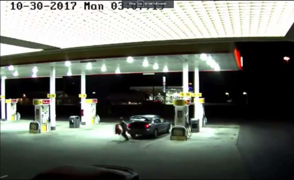 Surveillance video shows the woman running into the gas station, presumably seeking help, while the man ran out, got into his car and drove off.