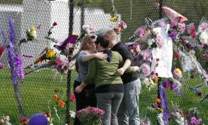 Prince fans embrace by a makeshift memorial outside Paisley Park, the home of singer Prince, on Thursday, April 21, 2016 in Chanhassen, Minn. The singer died Thursday at the age of 57. (AP Photo/Jim Mone)