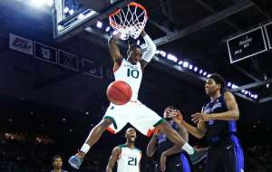 Miami guard Sheldon McClellan (10) dunks against Buffalo during the first half of a first-round NCAA college men’s basketball tournament game in Providence, R.I., Thursday, March 17, 2016. (AP Photo/Charles Krupa)