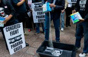 FILE – In this Oct. 1, 2015 file photo, AIDS activists pour cat litter on an image of Turing Pharmaceuticals CEO Martin Shkreli in a makeshift cat litter pan during a protest highlighting pharmaceutical drug pricing in New York. Shkreli, the former hedge fund manager under fire for buying a pharmaceutical company and ratcheting up the price of a life-saving drug, is in custody following a securities probe, Thursday, Dec. 17, 2015. (AP Photo/Craig Ruttle)