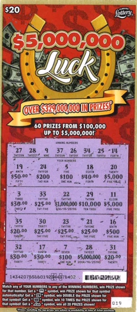 The $20 game, $5,000,000 LUCK, launched in September 2019 and features more than $329 million in cash prizes, including six top prizes of $5 million. The game’s overall odds of winning are 1-in-2.97.