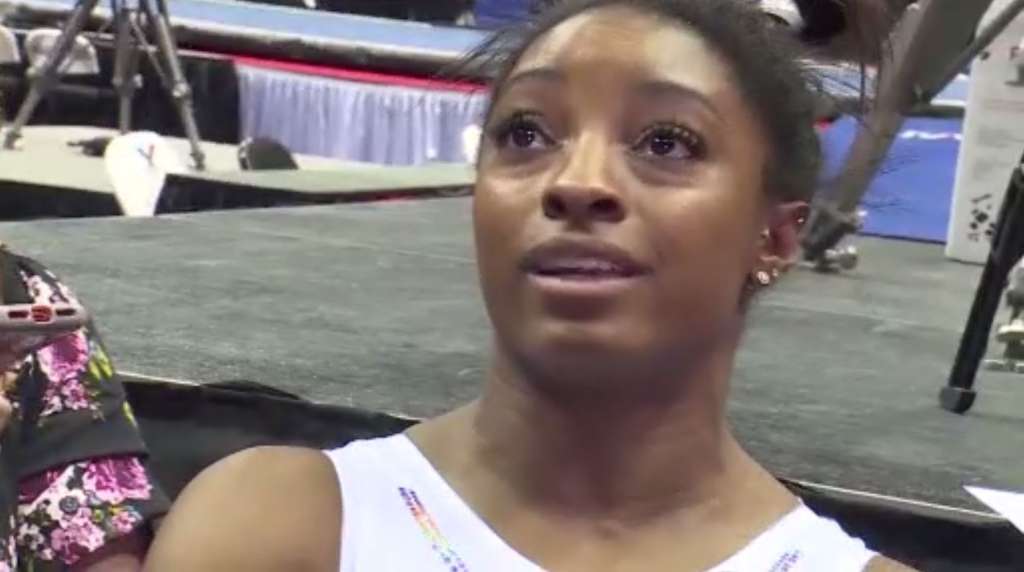 There were no muttered curse words this time. Only a borderline sarcastic jump for joy after she finished off a typically brilliant night by drilling her dismount on uneven bars to extend an unbeaten streak that began at the 2013 national championships. Biles gave coach Laurent Landi a relieved high-five before sticking out her tongue and waving her arms as she ran to hug the rest of competitors in her rotation.