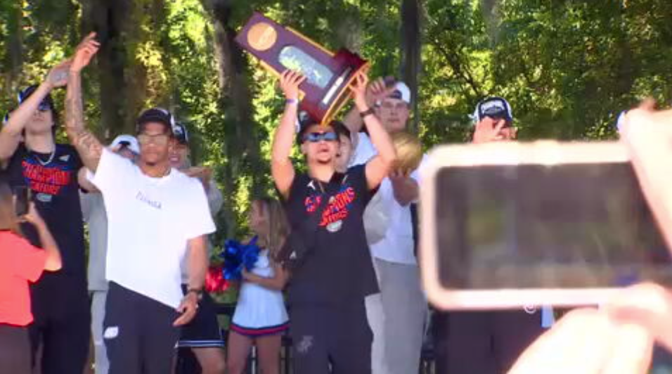 Highlights from Florida’s six NCAA Tournament victories flashed on the stadium replay boards as players and coaches were introduced one by one. Clayton, named most outstanding player of the Final Four, and Golden — hardly surprisingly — received the loudest ovations.