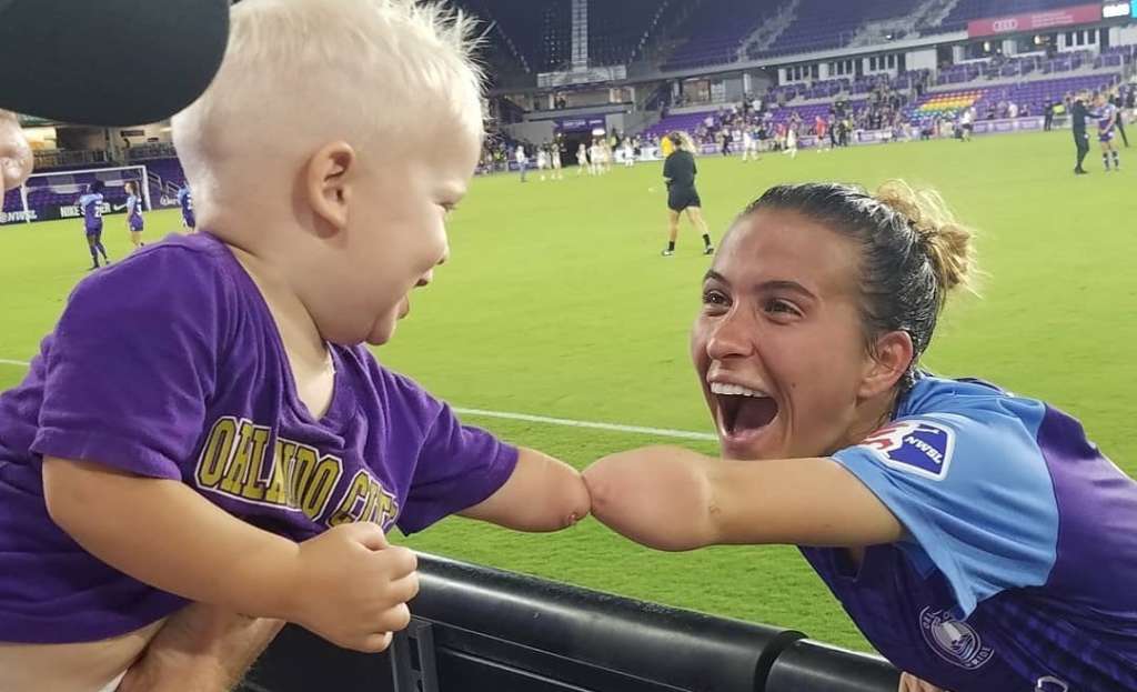 The photo shows the Orlando Pride’s Carson Pickett fistbumping with little Joseph Tidd.
