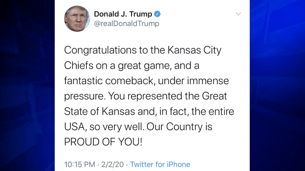 On the heels of the Kansas City Chiefs’ 31-20 Super Bowl victory over the San Francisco 49ers, Trump tweeted his congratulations to the Chiefs for a “fantastic comeback.” He added: “You represented the Great State of Kansas and, in fact, the entire USA, so well. Our Country is PROUD OF YOU!”