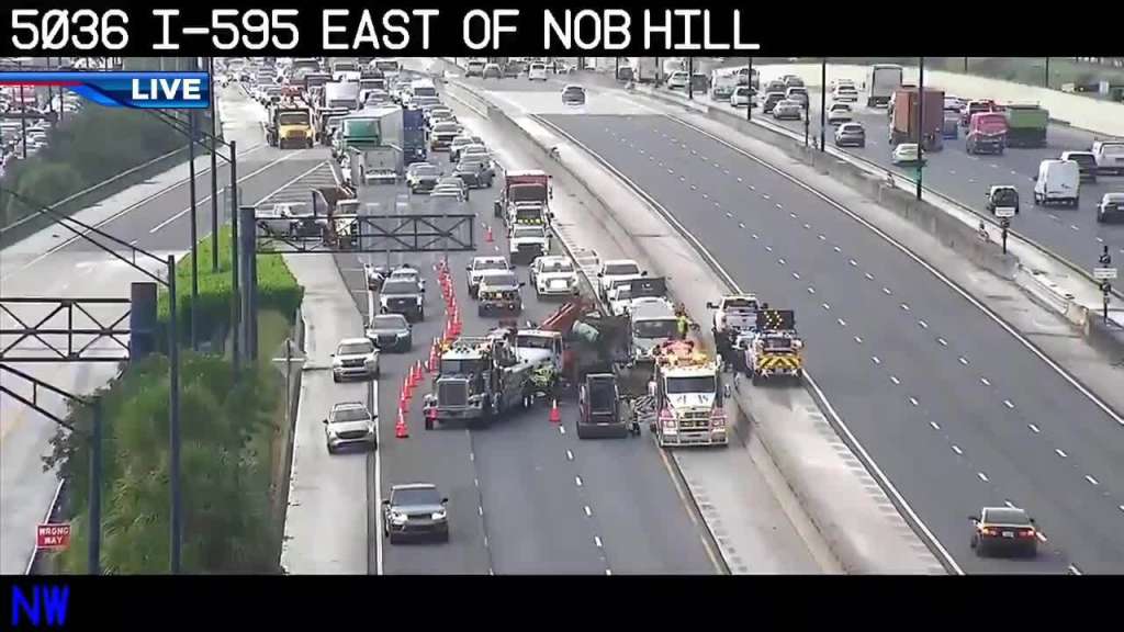 Crash leaves car rolled over on EB lanes of I-595 near Nob Hill Road in Davie; partial lanes closed