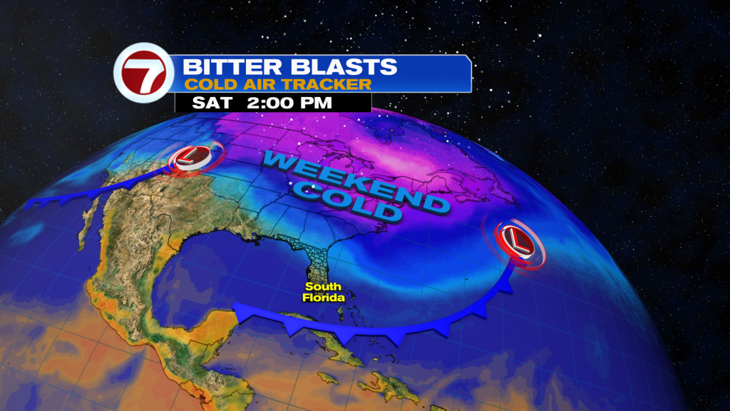 A cold front is responsible for this weekend’s drop in temperatures with widespread lows in the low to mid 50s across mainland South Florida Saturday morning.