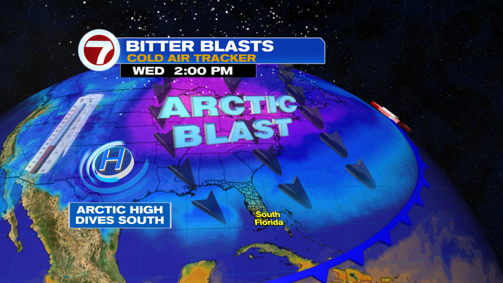 It will definitely be brief because another cold front will quickly sweep through Monday night, crashing in a prolonged period of colder temperatures. This time around, an Arctic area of high pressure will completely drop farther south into the central US, drawing in even colder temperatures into South Florida starting Tuesday.