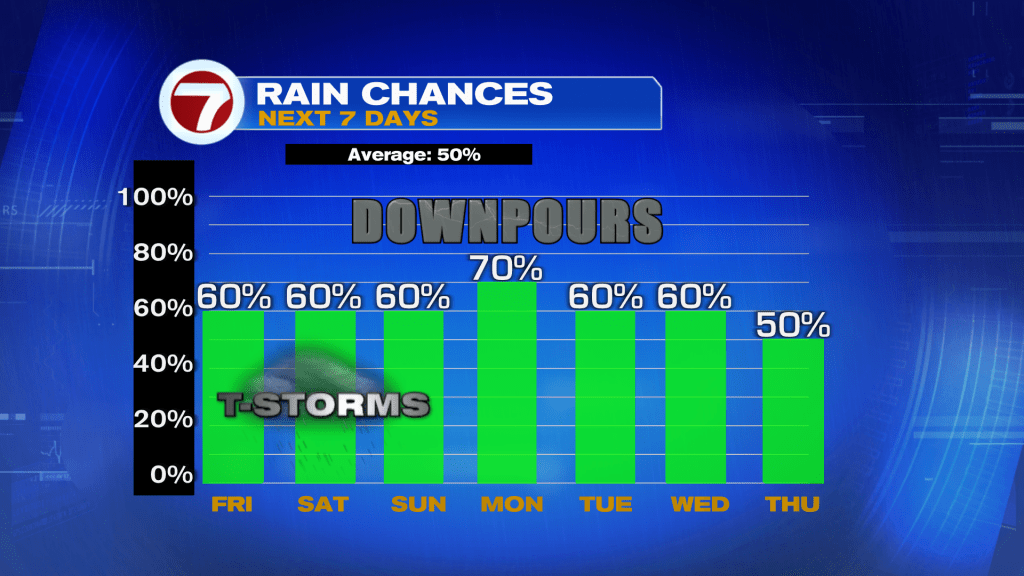 Next week will feature more of the same as fronts hang around Florida, essentially trapping plenty of moisture across the state. Rain chances will generally hover around 60%. Highs will hold above average overall in the low to mid 90s as we’ll be on the warm side and to the south of these fronts.