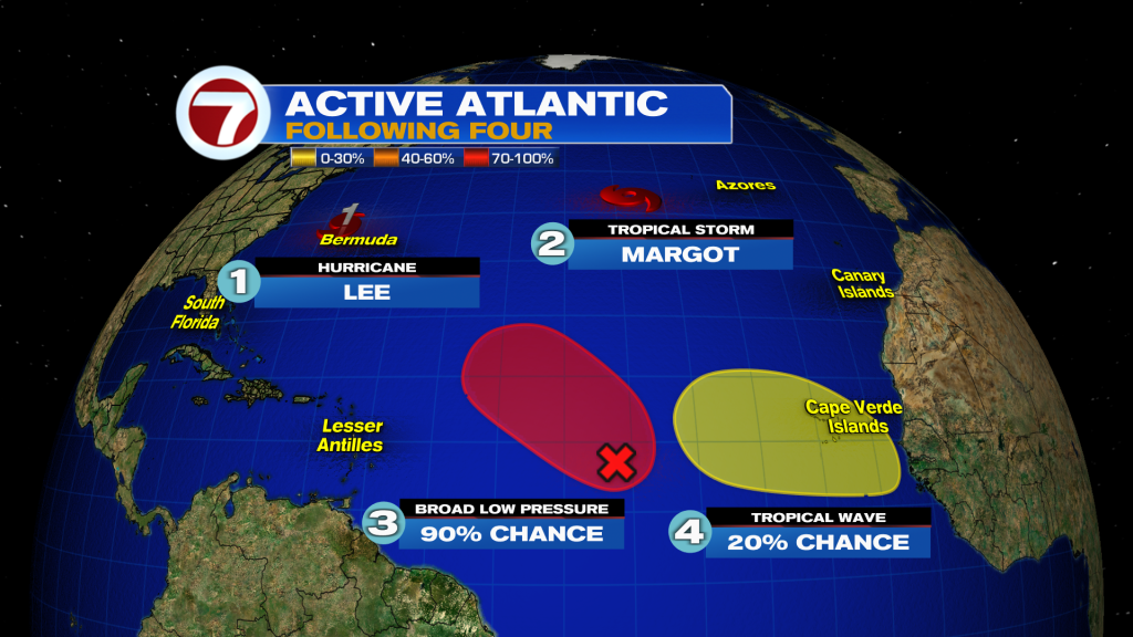 There is also Tropical Storm Margot and two other areas to watch for potential development, none of which are a threat to land over the next week or ever will be.