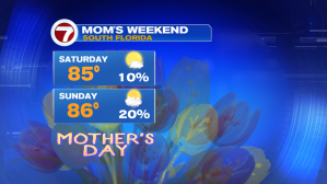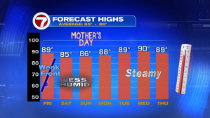 Saturday will see near typical highs in the mid 80s with plenty of sunshine, and Mother’s Day is promising to be nice and quiet with only a stray shower in the forecast.