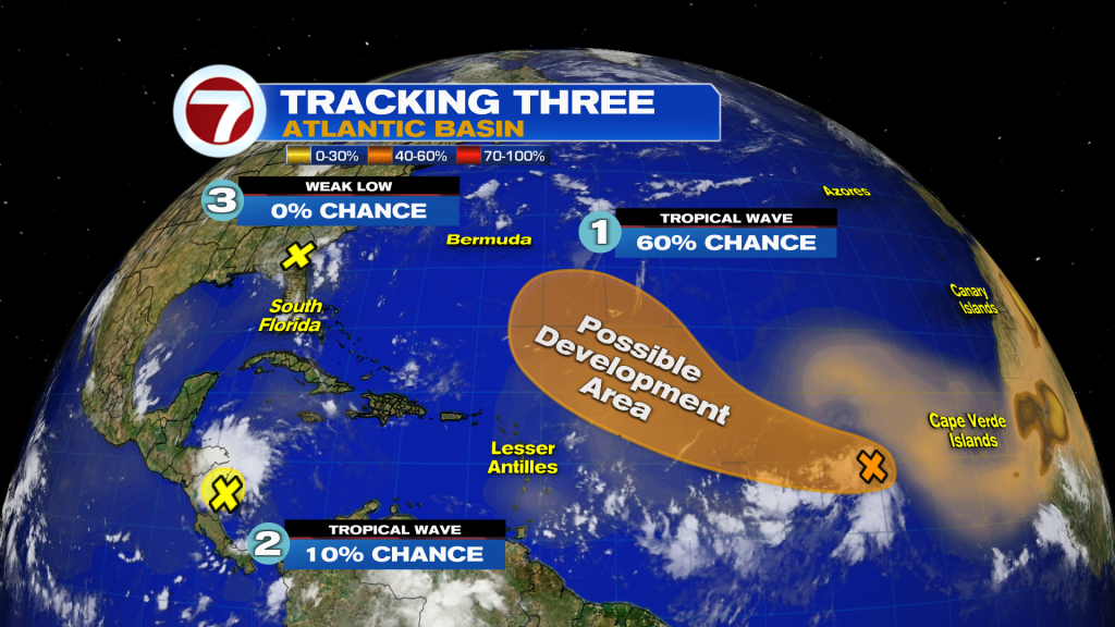 Showers and storms with a tropical wave located in the middle of the Atlantic Ocean are increasing and NHC has bumped the chance to a 60% of this area developing during the next 7 days.