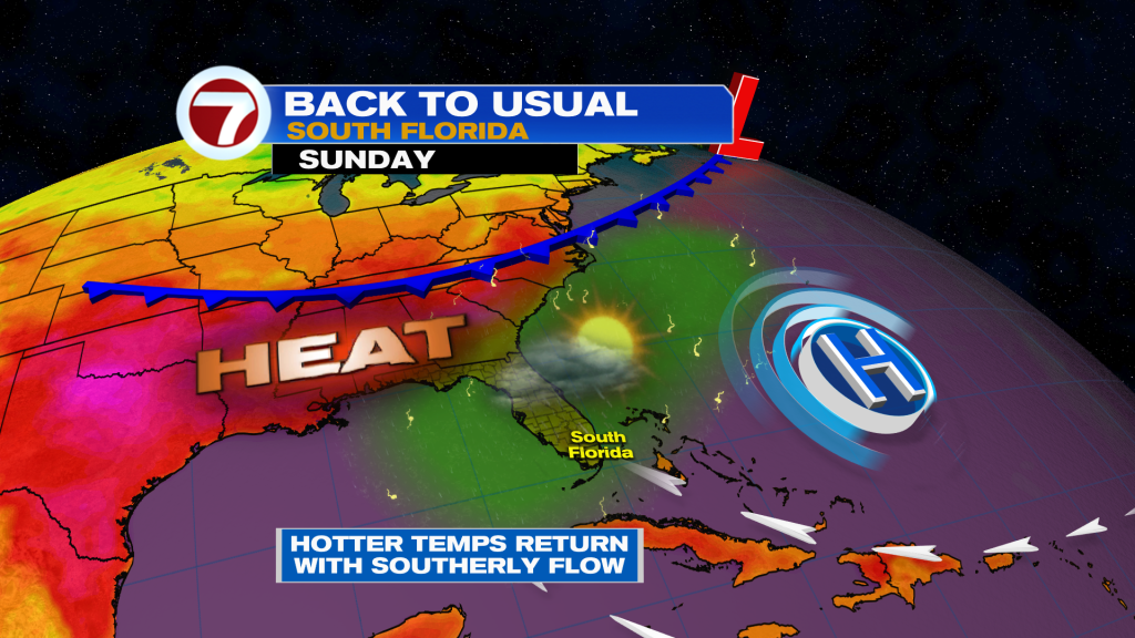 High pressure slides South and that should help conditions improve with drying taking place over the weekend. We will have more sunshine and steamy air filtering in with a chance of seeing a few pop-up storms in the afternoon. Highs will go up into the low 90’s. Back into the mid to upper 90’s next week.