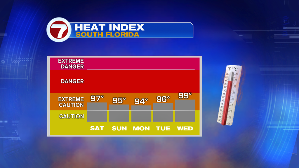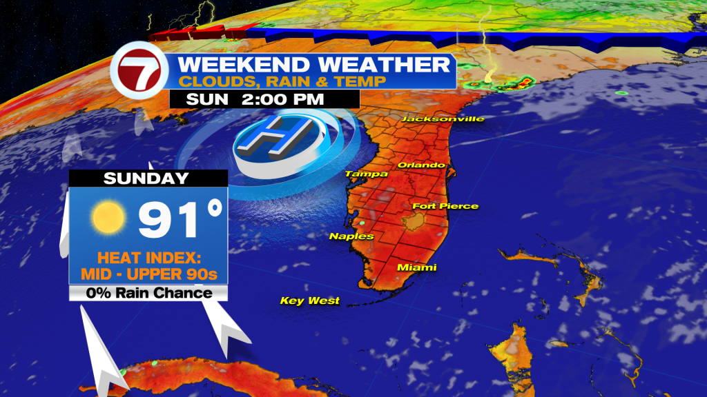 Expect highs this Saturday in the upper 80s to low 90s with feels-like temperatures in the mid to upper 90s given the high humidity. That will be paired with sunshine and a few clouds.