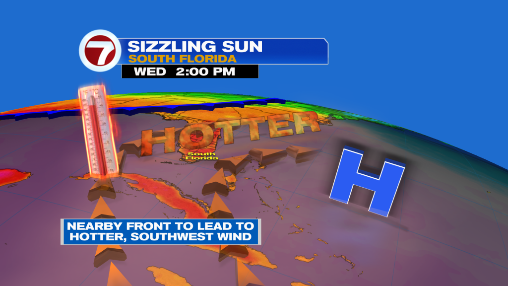 Heading into next week, the only main change will be that it turns hotter, especially Wednesday and Thursday. That’s because an approaching front will cause winds to veer out of the southwest. Therefore, expect highs across mainland locations to top off into the mid 90s.