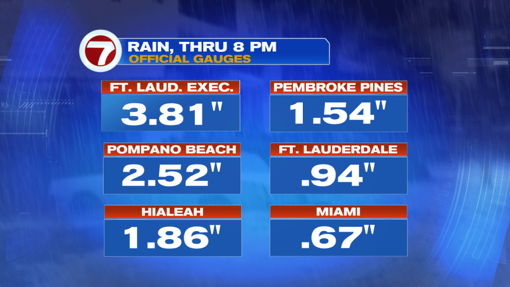 Above are the rainfall totals for a period of 24 hrs ending Tuesday at 8 pm. Many areas had gusty winds and street flooding. This is all due to a disturbance sitting right across South Florida. It’s not forecast to leave the area thru Thursday.