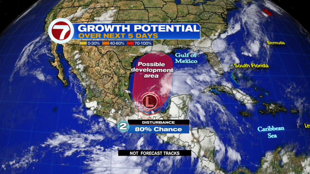 Tropical Storm Bill in Northern Atlantic should dissolve on Wednesday. That leaves a broad low in the Gulf of Mexico being watched for development by the National Hurricane Center. It has a high chance for growth in red area over a period of 5 days. A tropical wave in the Far eastern Atlantic monitored for organization has been snuffed out by Saharan Dust.