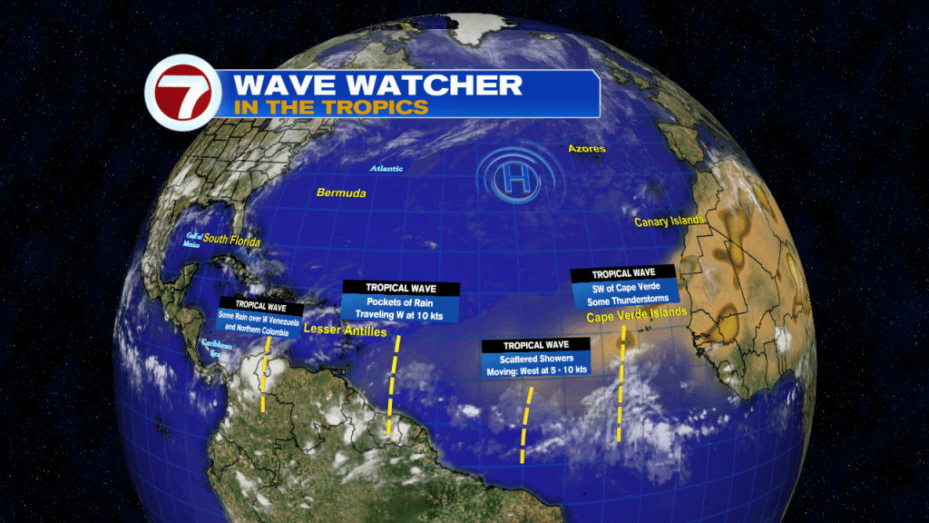 There are four tropical waves in the Atlantic and Caribbean Sea. All have some rain to them but we are not expecting any to develop.