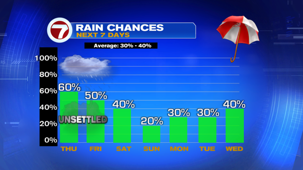 Typical Probabilities for the season range between 30% and 40%. We will be above that until Friday. Saturday should come down to average and drier by Sunday. Chances pick up again by next week.
