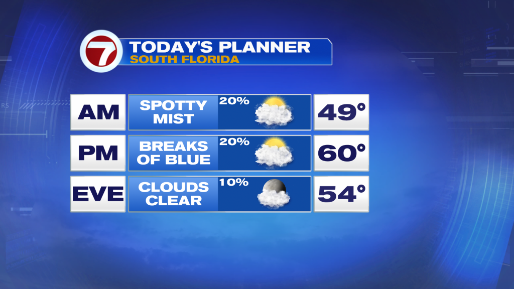 It’s been a cloudy, cool and foggy second half of the week across South Florida as the air has been rather saturated, spitting out a mist at times, while temperatures have been cold and constant.