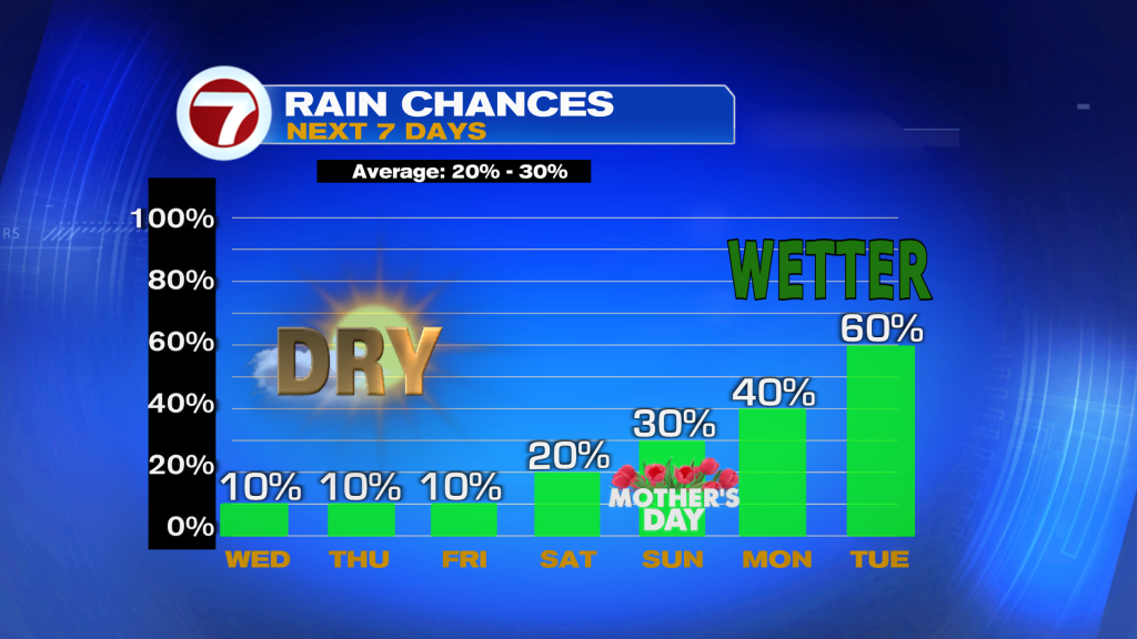 Barely a drop of rain is now in the forecast these next few days with just the chance for a stray shower. It’s not until early next week when rain likely returns to the forecast.