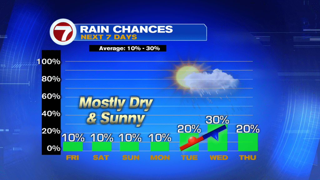 This will keep our pattern generally dry and quiet over the next 7 days, although in the long term around the middle of next week, a weak front could stall near or across the area, leading to the chance for showers.