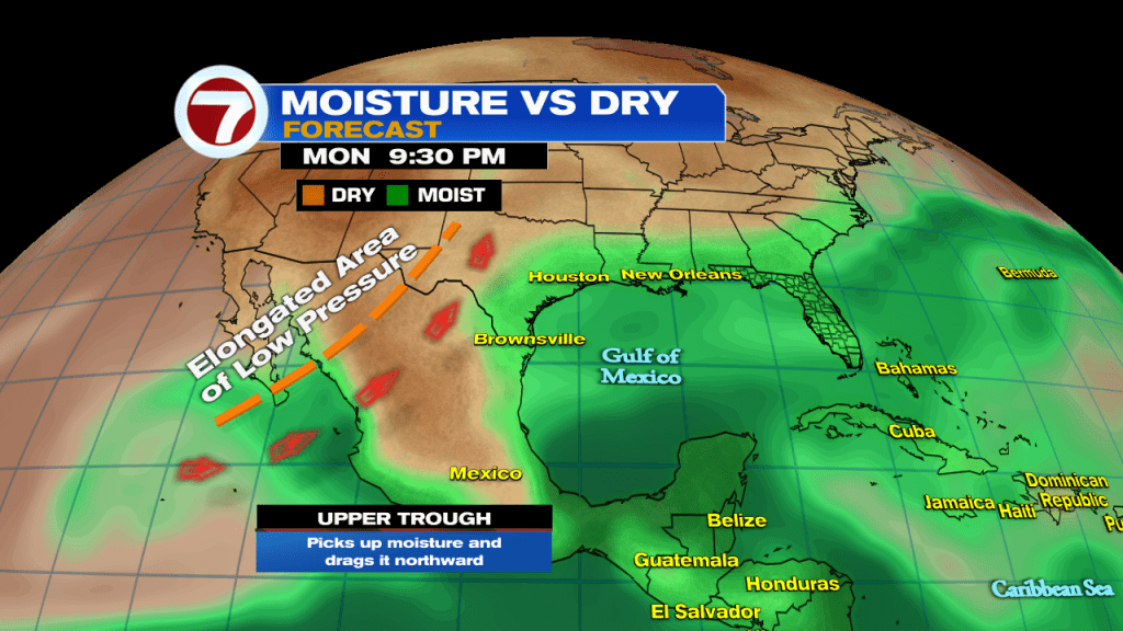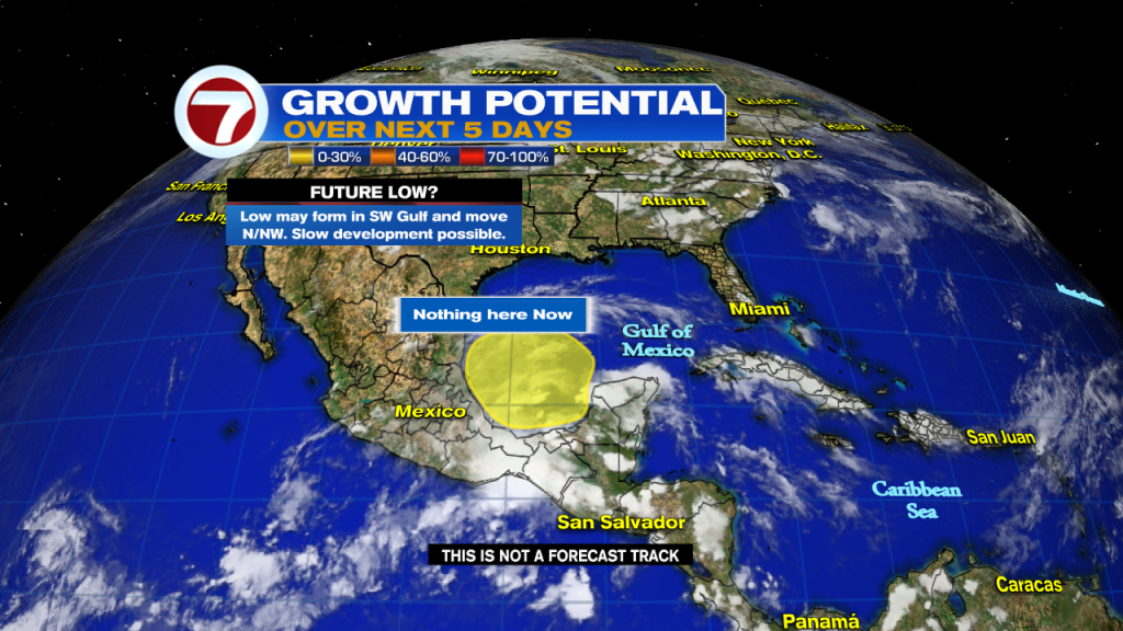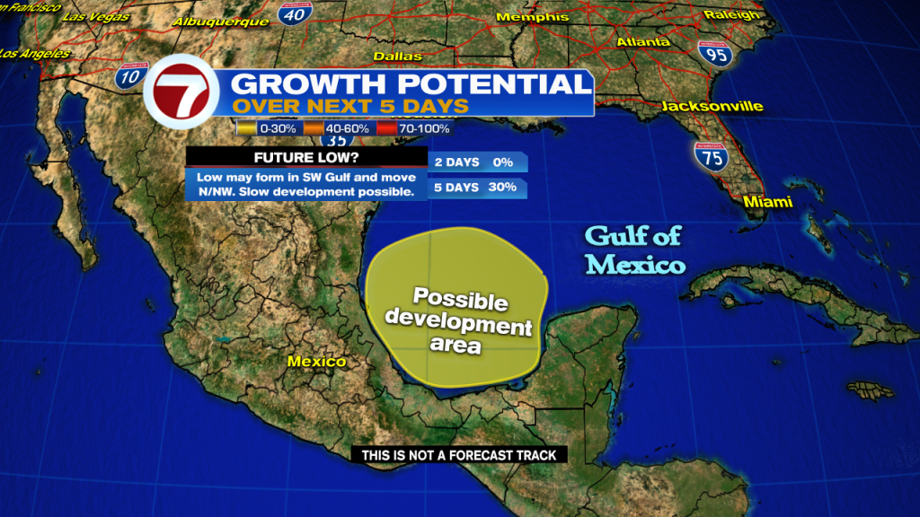 Even if it doesn’t organize, it could drop plenty of rain across TX & LA late next week. There is a trough (an elongated area of low pressure) over Mexico. This will drag northward moisture from the Gulf. It could mean heavy rain with flooding concerns. We’ll be watching.