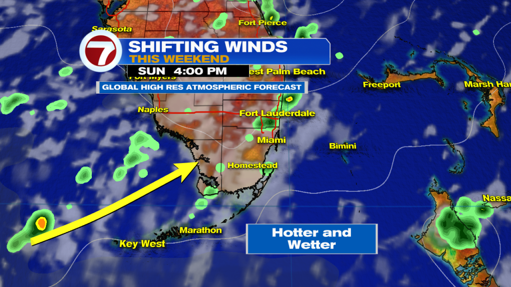 Our wind pattern will change this weekend. Instead of an onshore breeze that kept us mostly dry, the flow will now be out of the south – southwest. This will push tropical heat and humidity into South Florida. Across the Mainland showers will develop across the Western Suburbs and press towards the Coast in the afternoon.