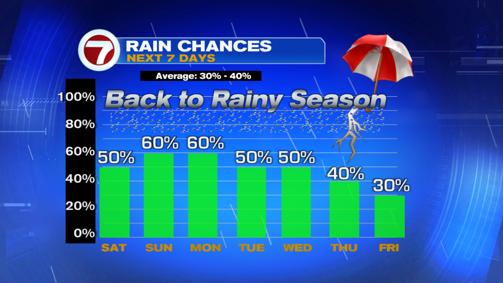 Rain chances will be above average thru Wednesday, with Sunday and Monday possibly being the wettest days out of the next seven.