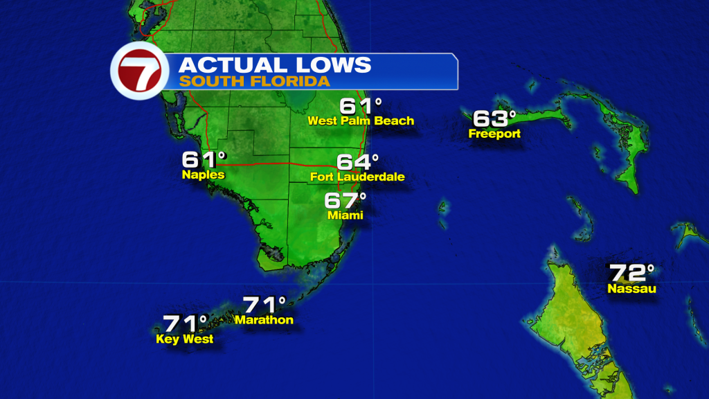 Hopefully everyone finished all of their holiday shopping! Christmas Eve is finally here and there are lots of preps for the big night. This morning we finally woke up to quiet and comfortably cool conditions. Unlike Tuesday morning’s low temperatures in the mid 70s, many areas of South Florida woke up to cool-ish 60s. Some inland areas of South Florida even dropped into the 50s! All it took was a change in our wind direction. Winds turned out of the north and were not as strong to start the day.
