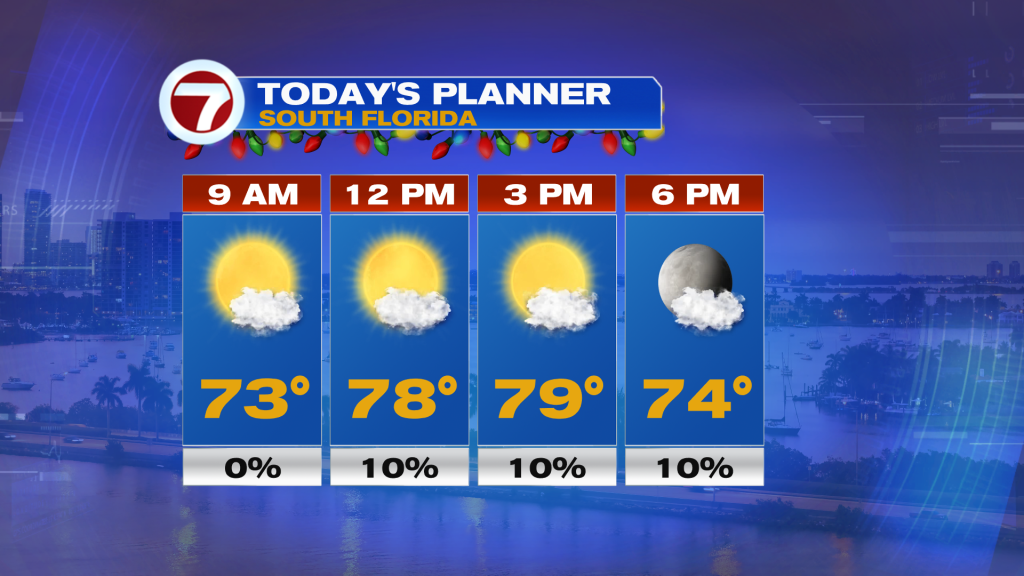 Today will once again be breezy. But unlike previous days where winds were whipping across South Florida, the breeze will be an enjoyable one. An area of high pressure will build across the area, bringing drier air with it. This should reduce the number of showers today. Other than a spotty shower, most areas will remain dry today while humidity levels remain comfortable. So if you have outdoor plans for ‘Noche Buena’, you should be good to go! With that said, if you are out late past midnight, a spotty shower will be possible!