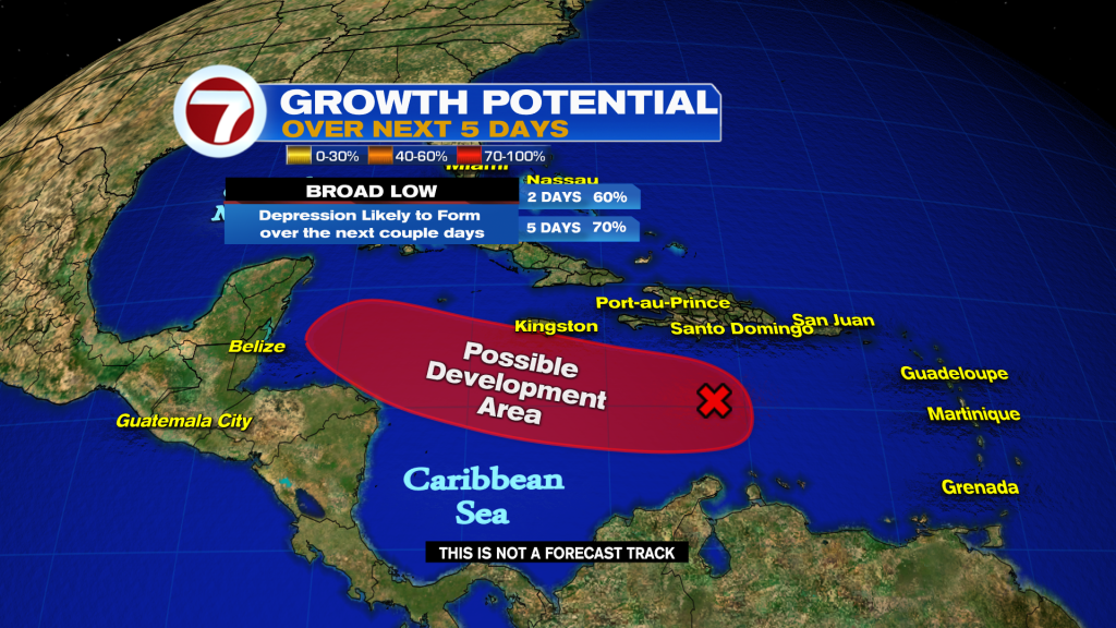 In the tropics, there remains two areas to watch. One near Bermuda with a low, 10% chance of forming and a broad low pressure system over the Caribbean Sea with a high, 70% chance of forming. This Caribbean system is expected to become a tropical depression over the next few days as it tracks in a general west to northwest direction. With a weak front over South Florida mid to late week, this is expected to protect us from this system and should instead steer it into Central America by next weekend. Regardless of development, heavy rain remains possible across many of the Caribbean Islands from the Lesser Antilles through Jamaica.