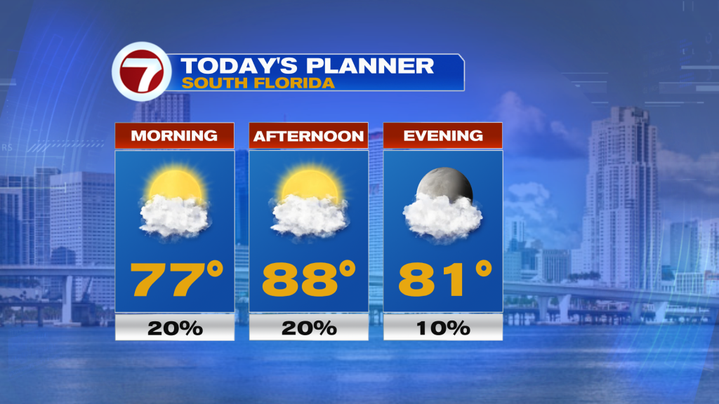 We remain in a rather quiet weather pattern in South Florida with no significant weather systems to track this weekend and into next week. On Sunday, weather conditions will be similar as Saturday, although I’m not expecting there to be as many showers as on Saturday. Instead, expect a blend of sun and clouds paired with a spotty shower, moderate humidity levels and high temperatures above average into the mid to upper 80s, which will feel closer to 90F due to the humidity.