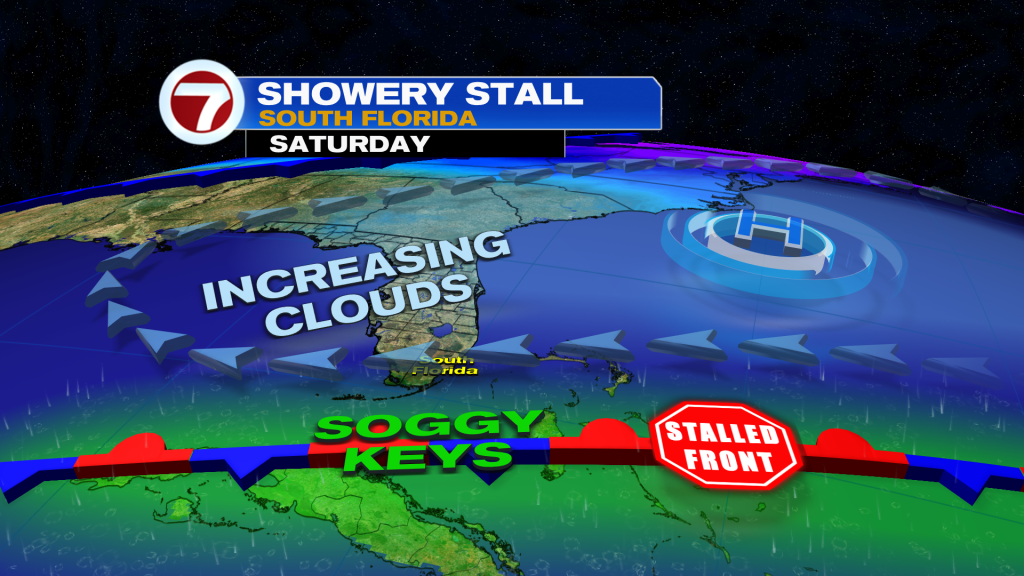 For Saturday, expect sunshine early then mostly cloudy skies with numerous showers across the Florida Keys. Some of those showers may sneak into parts of Miami-Dade and Broward Counties but it should remain dry overall.