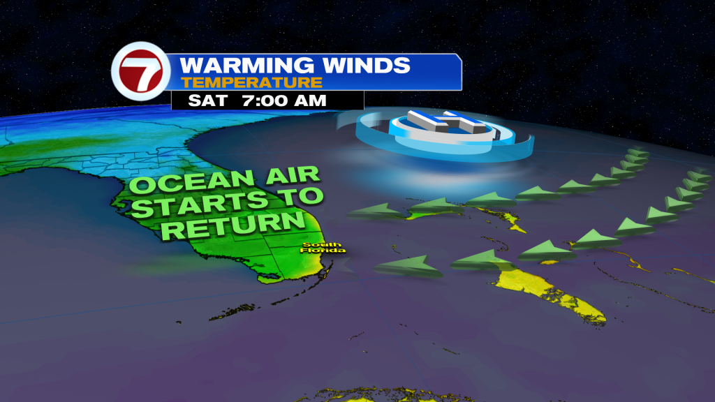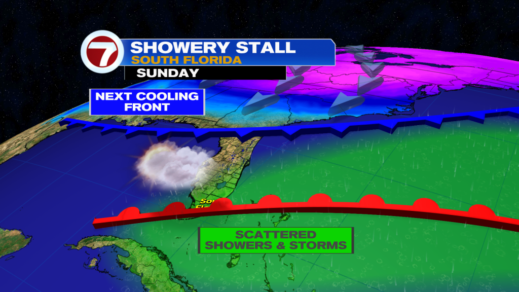 It will be mild and seasonable over the weekend with increasing humidity, especially come Sunday. A stalled front — the same one crossing through this evening — will start to surge back toward South Florida, leading to rising rain chances.