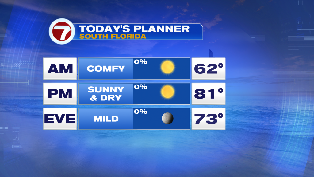 Today South Florida can expect a similar afternoon as yesterday except afternoon high temperatures could be a degree or two warmer. South Florida highs will reach into the lower 80s (which is typical) while we continue to enjoy rain-free conditions, comfortable humidity levels and plenty of sunshine. Temperatures overall are what we call ‘average’ for this time of year for South Florida. These quiet conditions are all courtesy of a large area of high pressure directly overhead, together with plenty of dry air across the region.