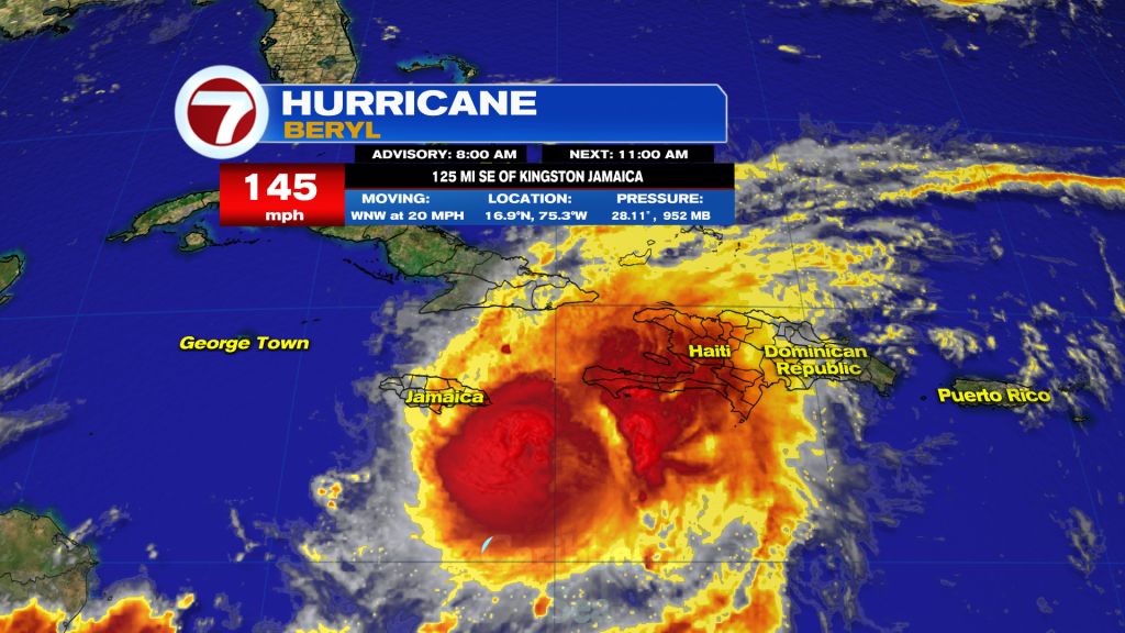 The core of dangerous Hurricane Beryl is expected to impact Jamaica midday bringing life-threatening winds and storm surge.